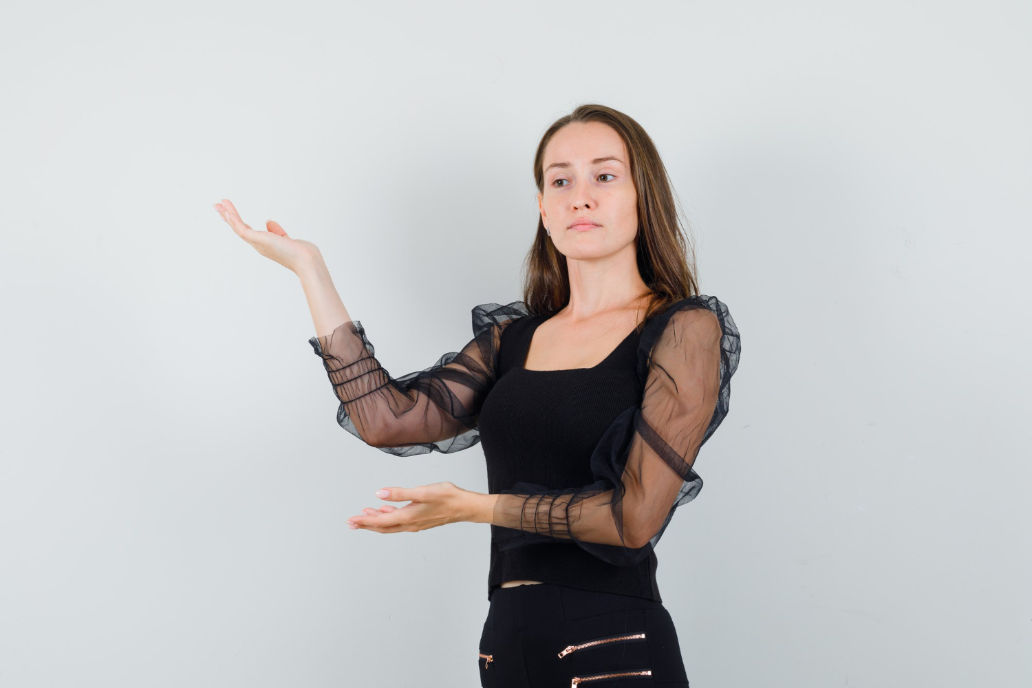 Certain outfits call for specific arm and hand placements. If I’m wearing a dramatic gown with oversized sleeves, I use my arms to showcase the fabric’s movement. I might raise one arm or let the sleeve cascade as I turn slightly. If I’m modeling swimwear or lingerie, my arms and hands become part of how I shape and highlight my silhouette. I’ll place a hand at the small of my back, cradle an elbow, or touch my collarbone to convey intimacy and softness.